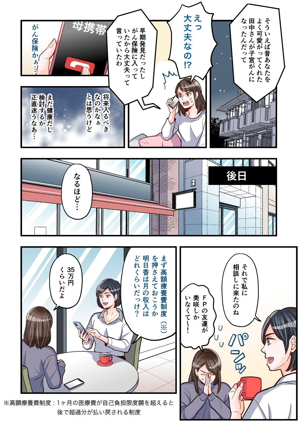 さらに漫画で触れているとおり、「高額療養費制度」という仕組みも活用できます。これは1ヵ月にかかった医療費が自己負担限度額を超えると、超過分が後日払い戻される制度です。自己負担限度額は、各自の収入によって決まります。この制度は年に何回でも利用することができる上に、直近12ヵ月の間に高額療養費制度による払い戻しを3回受けている場合には、4回目以降の自己負担額が引き下げられるという仕組みもあります。特に、がんのように医療費が高額になりやすい病気に対して、非常に頼りになる制度といえるでしょう。