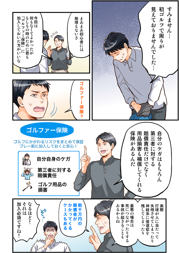 休日を有意義に過ごすための趣味として、あるいは、ビジネスの接待ツールとして、多くの人が楽しんでいるゴルフ。自然に囲まれた場所で心地よい汗を流し、気持ちよいショットが打てれば誰もが気分爽快になれるスポーツです。でも、そんなゴルフにも思わぬ危険が……。ここでは、ゴルフに潜んでいる意外なトラブルと、そんな不安を払拭してくれるゴルファー保険について紹介します。
