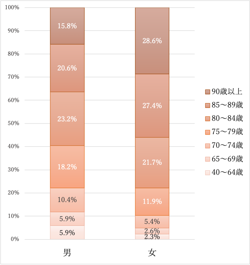 以下の図は、男女別にみた要介護者等の年齢階級別構成割合です。要介護者のうち75歳以降の割合が多くなっています。さらに65歳から75歳でも一定数の介護認定者がみられることにも注目です。