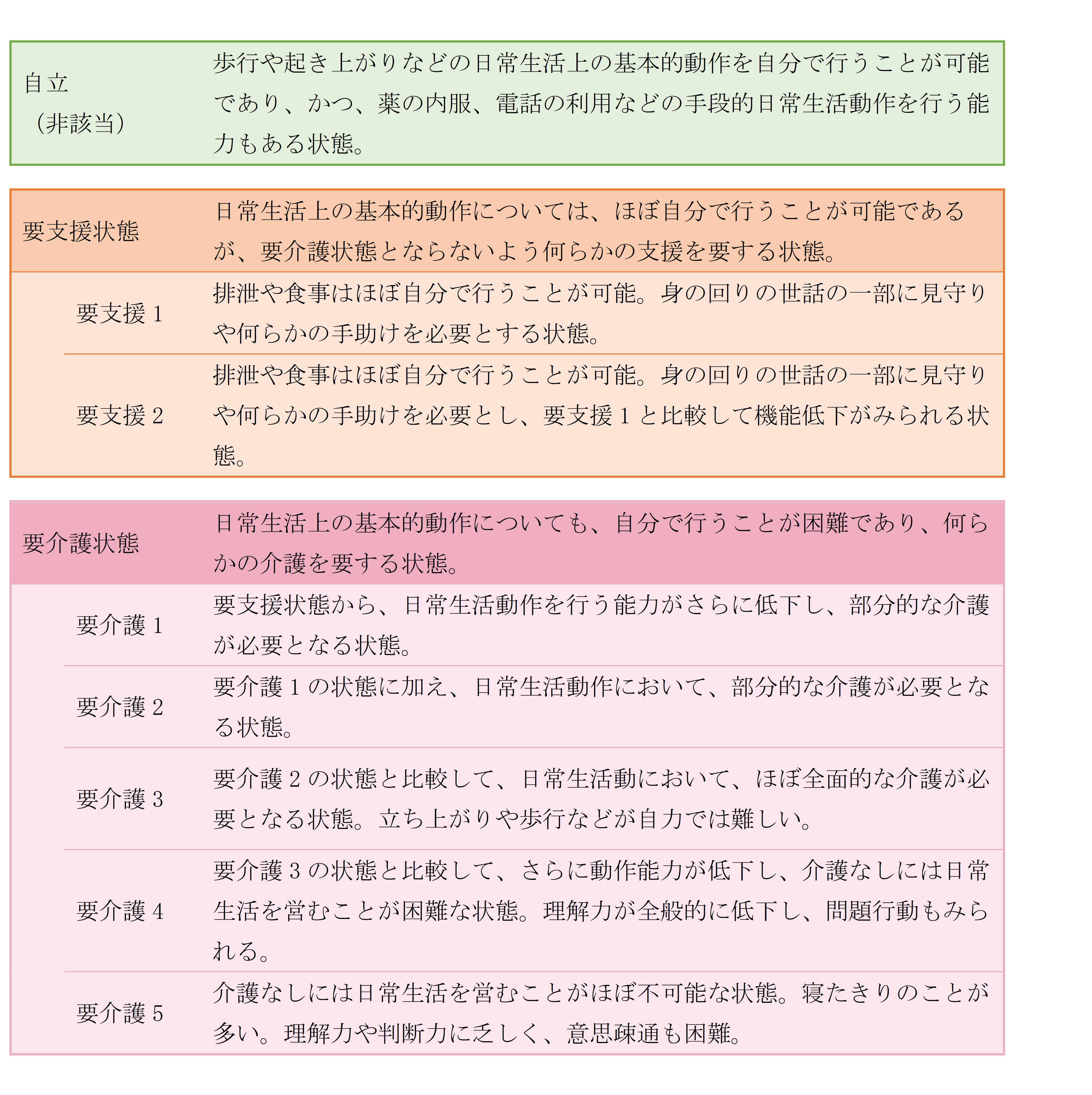 公的介護保険制度では、介護や支援が必要な要介護(要支援)認定者を、状態により要支援1〜2、要介護1〜5の7段階に区分しています。それぞれの基準と状態のめやすは以下のとおりです。