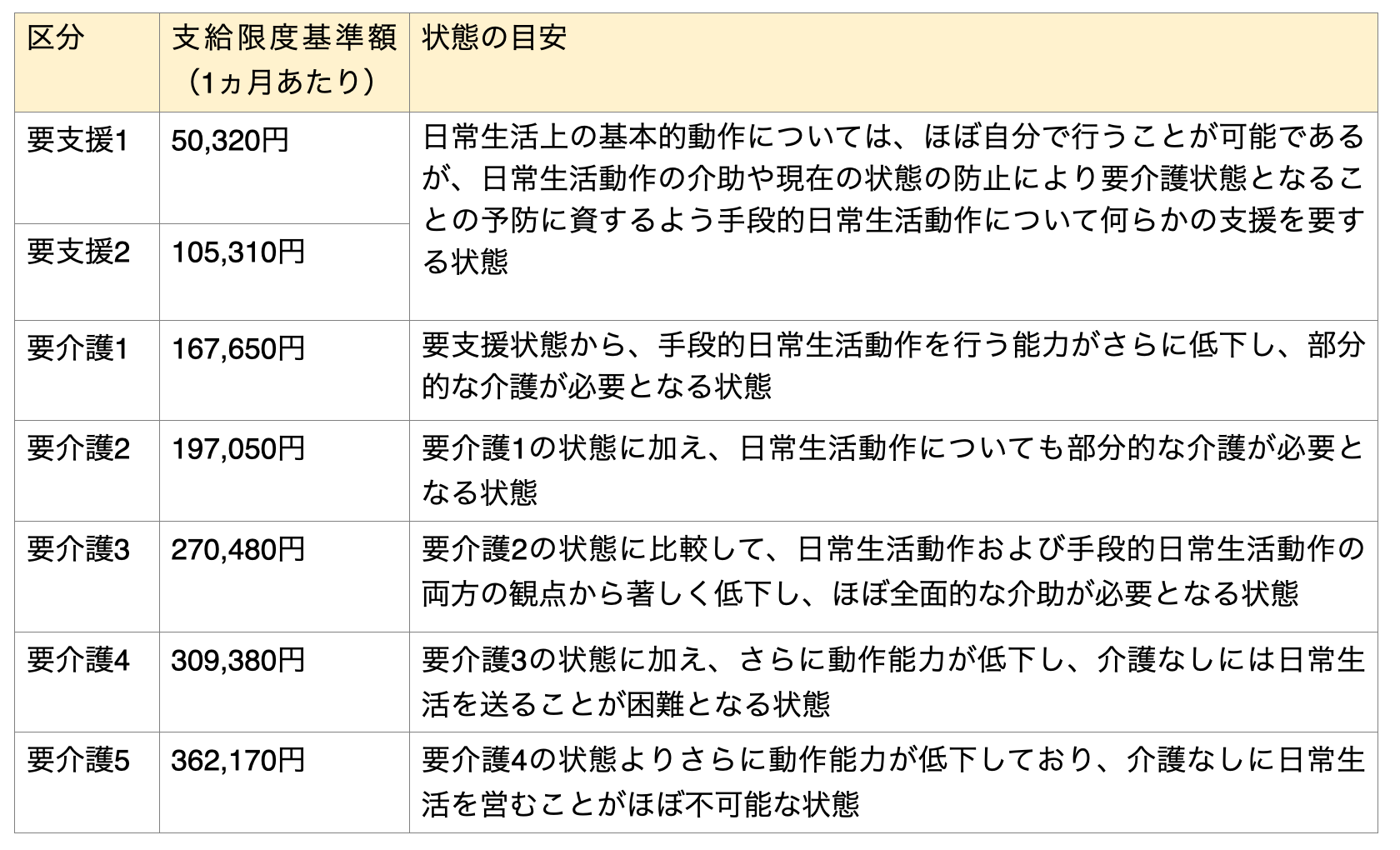 ▽要介護、要支援の区分と支給限度額、状態の目安