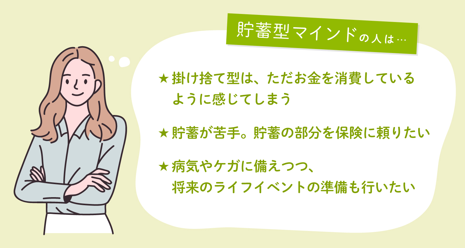 貯蓄型と掛け捨て型はそれぞれに違いがあるため、自分に合ったものを選ぶことが大切です。その判断基準のひとつに、“保険に対する考え方” があります。ここでは貯蓄型が向いている人、掛け捨て型が向いている人の考え方を解説します。